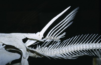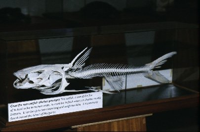 The underside of the skull covering has a bony structure which can be seen when all the flesh and soft parts are removed. It then looks like a crucifix or like a painting of Christ crucified, and is surrounded by a Weberian bone in form of a halo. The upper rough part of the skull roof which is also visible on the living fish, looks like a Monk with a cowl and hood and his arms outstretched in prayer. Others see this as a Roman soldier with armour on his chest and the dorsal fin spine is the lance which he opened up Christs side.