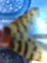 It did not take long for me to get in touch and, after phoning Kevin Webb to check that this Synodontis had small eyes and banding to the tail, confirm with Martin that we had a Synodontis katangae in our midst and that this was the first S. katangae, as far as we know, available to aquarists in the Ryedale area for at least 30 years - if ever. Aquarium care Martin now tells us how this fish is kept:- The S. katangae was placed into a 36"x12"x15" aquarium. This tank is filtered by a Rio Power Filter. I try to keep the pH at 7 but sometimes this, despite my best efforts, does fall and this affects the katangae by making his eyes go distinctly cloudy. Thankfully a quick water change soon puts this right. Although active, I have found the S. katangae to be a peaceful species which lives quite happily in the company of Golden Australe killifish and various Betta species (including Betta picta). He enjoys the peace afforded by a bogwood cave and is an avid consumer of bloodworms. Over the past few months, as David and Kevin will testify, the katangae has put on a good rate of growth. In order for some photographs to be taken I gave the katangae his first 'show bench experience' at the recent Ryedale A.S. Open Show.